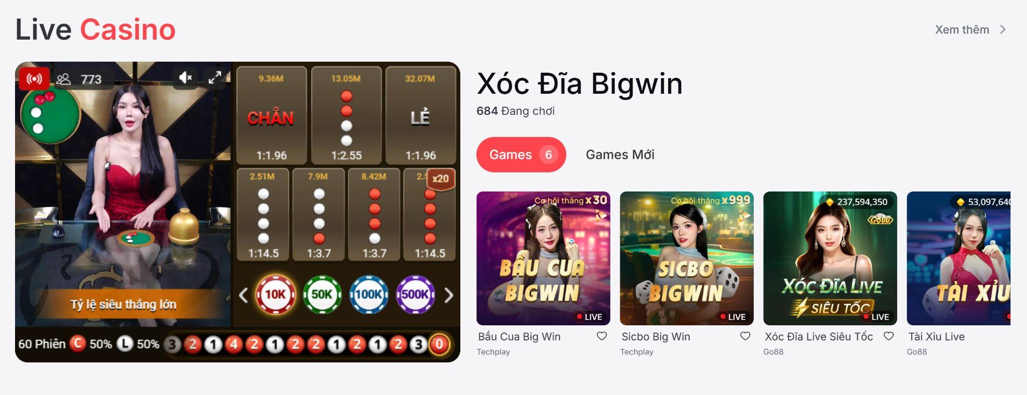Live Casino BIG88 mang đến trải nghiệm sòng bài trực tuyến chân thực với hơn 200 bàn chơi và dealer chuyên nghiệp phục vụ 24/7. Hệ thống streaming HD không độ trễ cho phép người chơi tương tác trực tiếp với dealer và theo dõi mọi pha bài một cách rõ nét nhất.